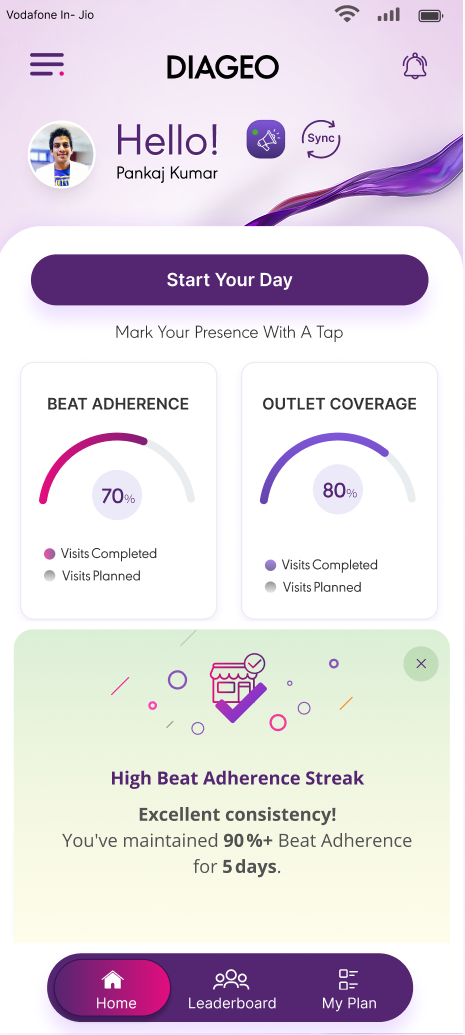 The objective was to build a robust, scalable, in-house mobile solution that would align with Diageo’s business processes and give full control over field operations. The platform needed to support flexible workflows for sales teams and merchandisers, deliver smart nudges to improve compliance and motivation, and provide offline-first reliability to ensure uninterrupted performance in remote field locations. Additionally, seamless Salesforce integration was crucial for enabling real-time visibility, faster decision-making, and data-driven management oversight.